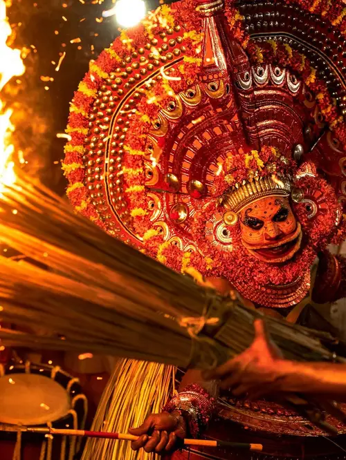Greet the sunrise with an early morning fire Theyyam performance—a spiritual fusion like no other. Usually, fire Theyyam starts around 4 AM.