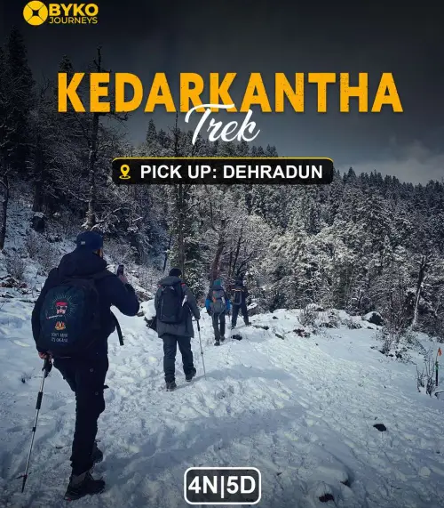 Get ready for an uphill trek of 4 kms to the Kedarkantha Base Camp. It takes around 3-4 hours to reach the campsite, which offers clear views of the Kedar Kantha peak.