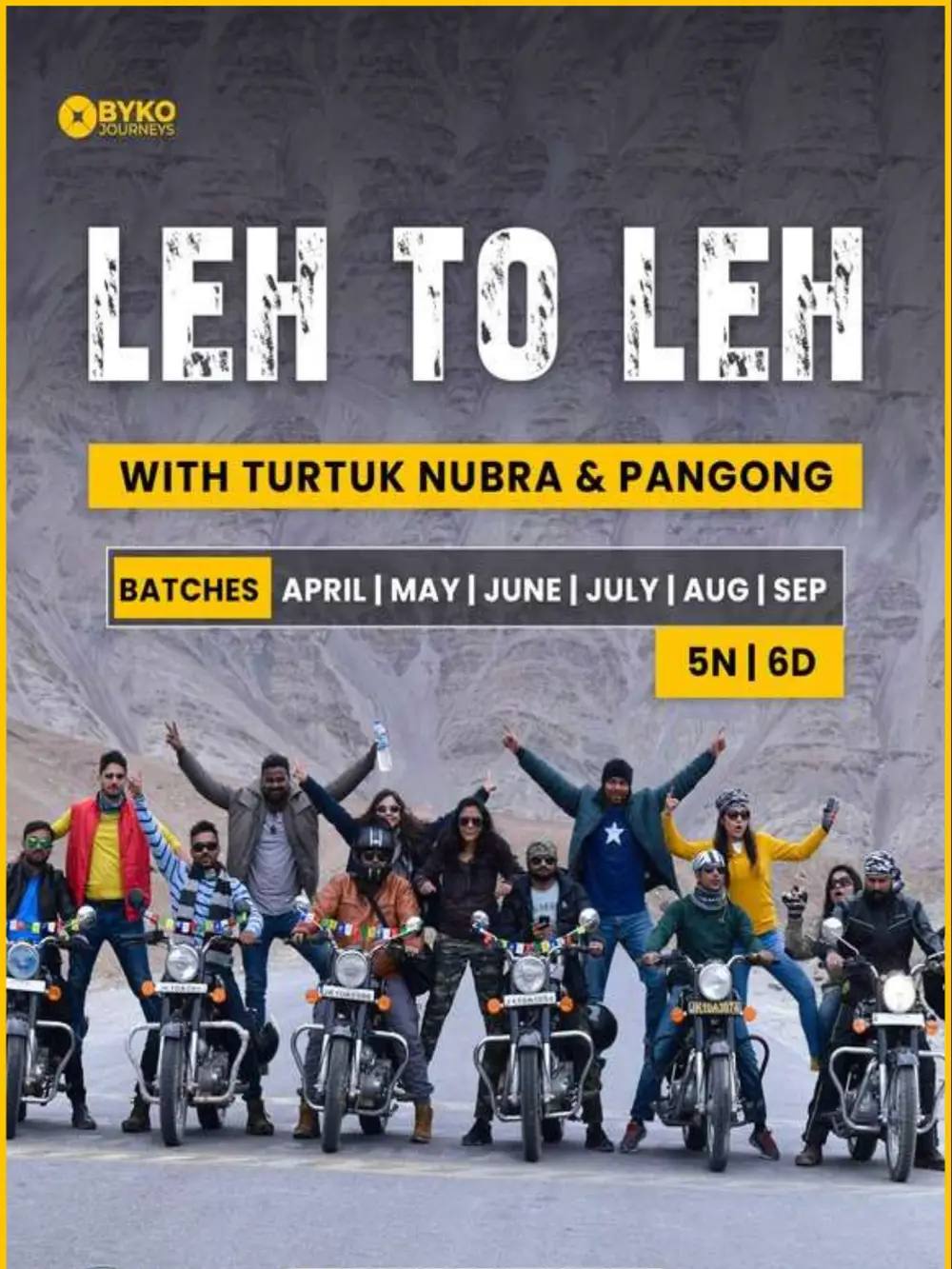 | Dual Rider | Re Himalyan with Pillion Single Sharing | ₹32,374 per person | ₹28,166 per person | ₹25,556 per person | Leh Airport, Leh, Ladakh, India, Asia | Leh Airport, Leh, Ladakh, India, Asia | Breakfast, Lunch, Dinner, Camp, Fuel, Car Transport, Mechanical Assistance, Bonfire, Parking |